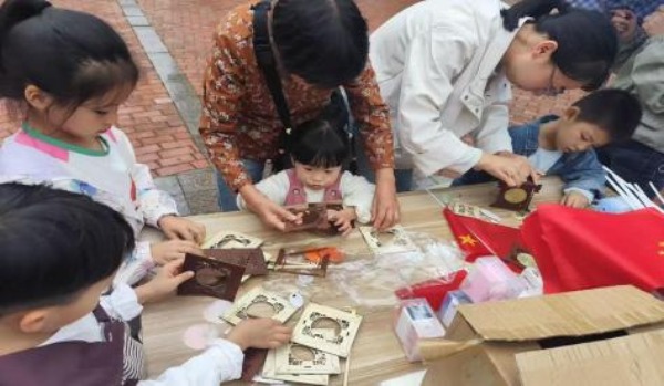 活動中,家長和孩子分工協(xié)作,有人勾勒國旗紋路,有 人調配“ 中國紅” ,有人繪制“我愛中國”“五角星”等國 慶元素,圖案躍然娃娃身上。孩子們舉著作品歡呼,家長用 鏡頭定格溫馨,現(xiàn)場歡聲笑語不斷,童趣與愛國情懷在色彩 中交融綻放。